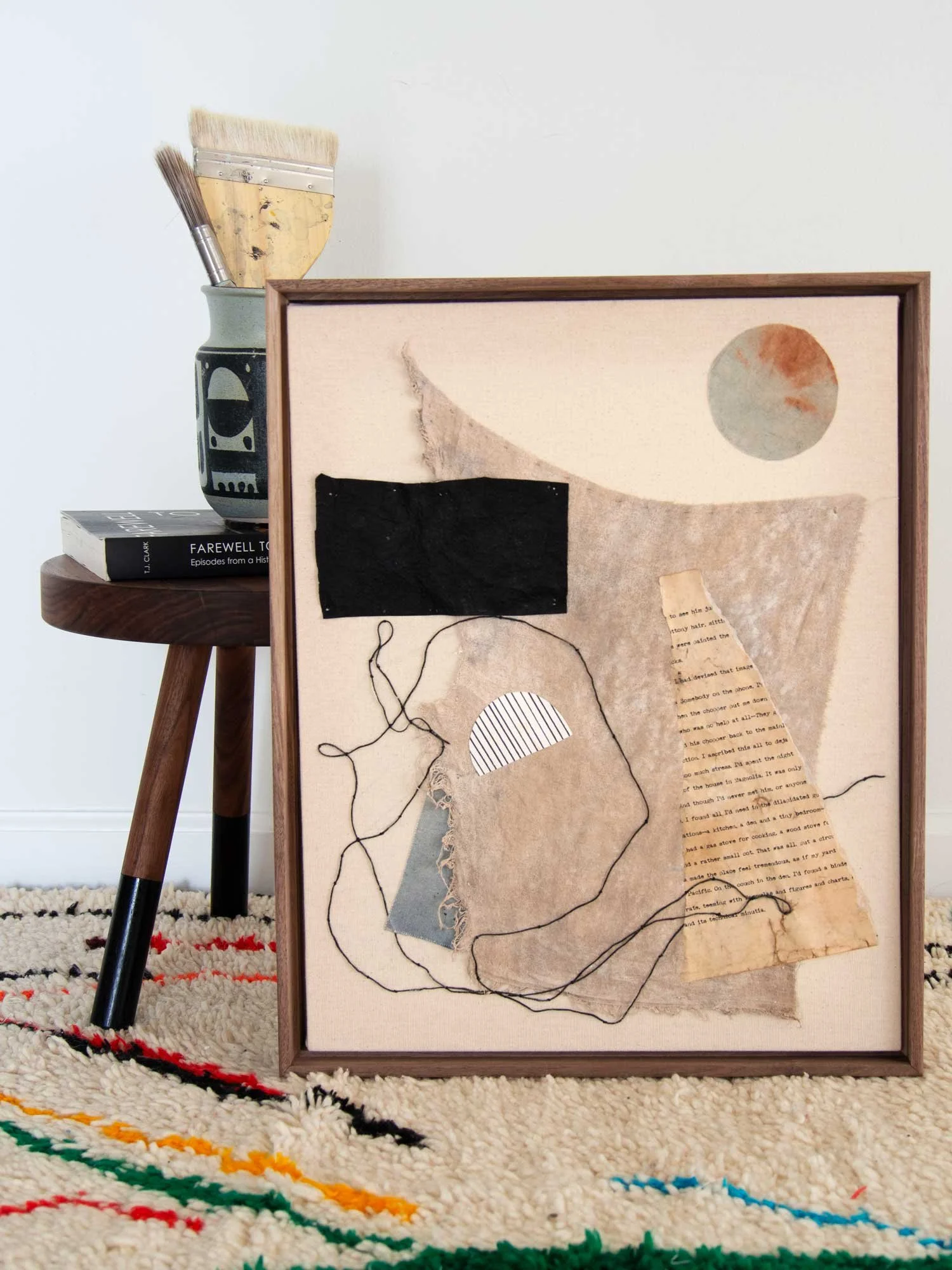 acrylic, dyed fabric, burned burlap, paper & string on canvas